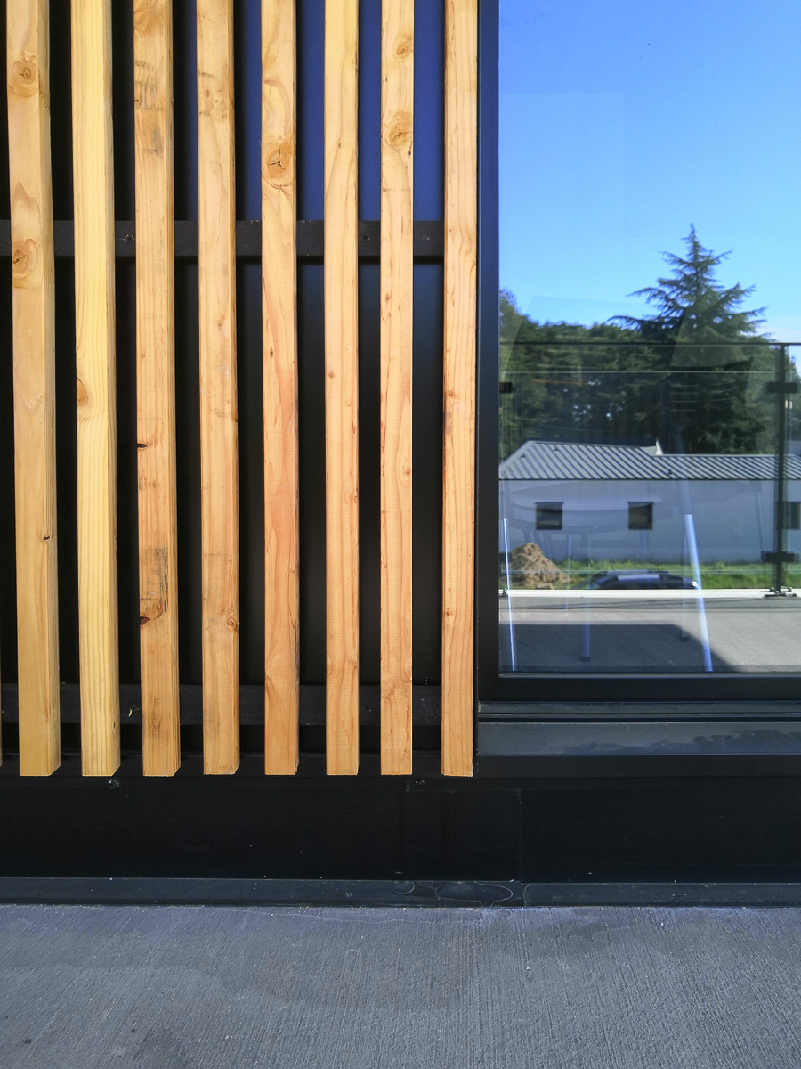 Assorti avec la métallerie d’un noir sobre, le bois de la coursive et de l’escalier apporte un complément de chaleur au bâtiment.